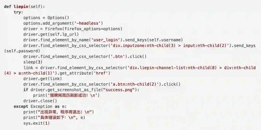 本工具主要是使用selenium来操作浏览器,实现元素定位、按钮点击和url请求,然后通过点击成功后页面信息的变化判断和截图判断的方式来确定是否成功刷新简历。另外本文只操作了猎聘网和智联招聘网站,因为自己用到这两个网站比较多,很多好机会都是从这两个网站获得的。其他招聘网站还请各位自行研究。比如如何识别验证码等。