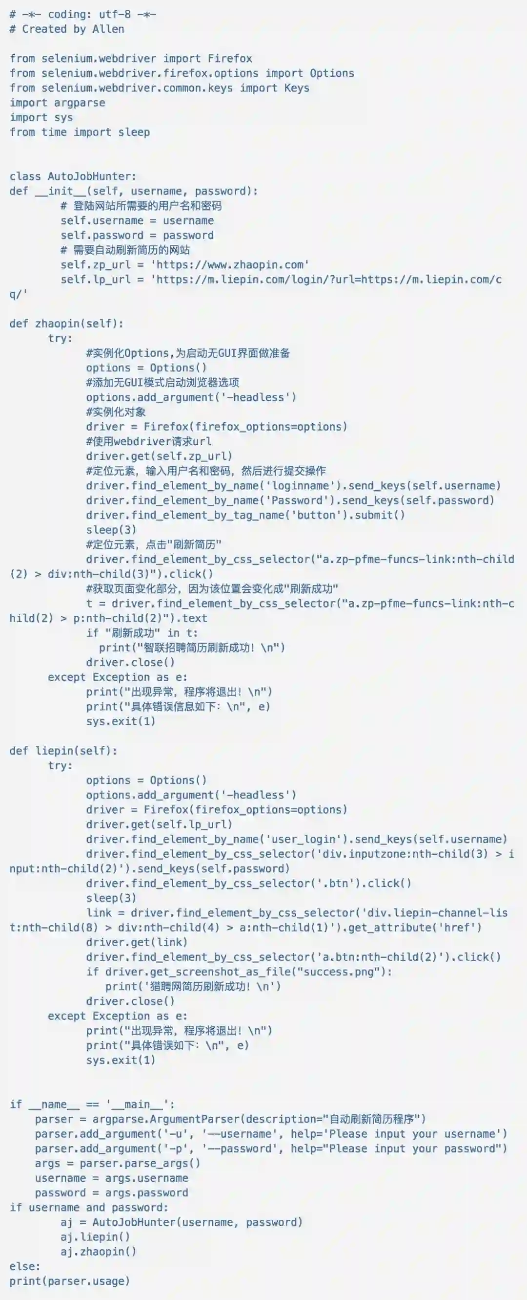 因为我们需要无GUI模式启动浏览器,所以Options必不可少,在其中加入‘headless’ 参数后便可以悄无声音地刷新简历,这样老板就不会看到我们在看其他机会啦。哈哈。在注释里已经说得相对明白了。其实主要在于如何去定位元素,然后操作元素。Selenium提供了8种定位元素的方法,大家有兴趣可以去官网看看。我们用得最多的还是.find_element_by_name、.find_element_by_tag_name 和 .find_element_by_class_selector。当然其他定位元素的方法只要能实现的都没问题,看自己喜好。