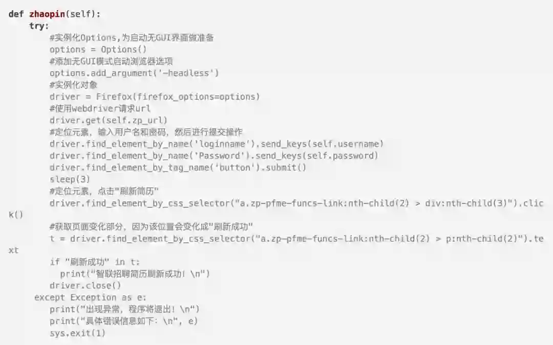 然后我们需要操作两个网站的简历自动刷新,那我们来定义两个方法吧,我真的想称之为函数。C/C++中毒太深!两个方法我取了个拼音,好low有没有!zhaopin() and liepin()。这个两个方法的内容大同小异,因为每个网站的结构不一样,所以造成了需要设定两个方法。以zhaopin()这个方法来讲解。