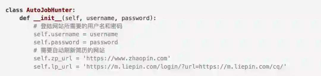 代码初始化了用户名和密码,而且定义了需要进行自动刷新简历的网站。后面的方法中会用到这些参数和变量。有盆友会问,为什么是m.liepin.com而不是www.leipin.com呢?后面会一一解释。