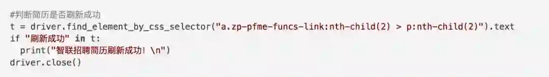 而我们定义的t主要是来获取文字变化后状态,因为该网站简历刷新后文字会变成“刷新成功”。以此我们可以来判断是否刷新成功。最后关闭driver,一定得关闭,不然Firefox可能还在后台运行。