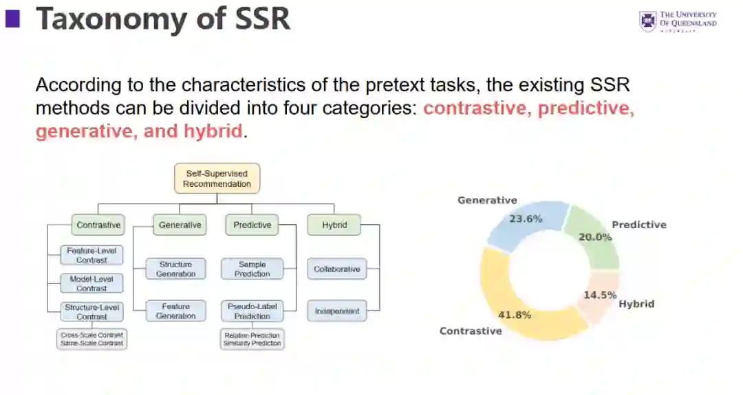 随后重点讲述了基于对比学习的推荐系统的分类,即对比式、生成式、预测式以及混合式,