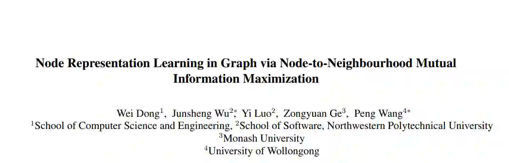 在CVPR 2022: Node Representation Learning in Graph via Node-to-Neighbourhood Mutual Information Maximization文章中,作者提出了一种简单有效的自监督节点表示学习策略框架,其通过直接最大化节点及其邻域的隐藏表示之间的互信息,并从理论上可以证明它与图平滑的联系。基于对比学习中的InfoNCE损失函数,文章提出的策略框架可由设计的代理损失函数进行优化,在此正样本的选择对于表示学习的质量和效率至关重要。为了选择高质量的正样本,文章中提出了一种拓扑感知的正样本采样策略,该策略通过考虑节点之间的结构依赖性来对邻域进行正样本采样,且在模型训练之前即可完成采样工作。文章中的采样策略甚至可以从邻域中仅仅采样一个最重要的正样本进行随后的模型训练,在这种极端的采样操作下,文章中的模型完全避免了具有高空间复杂度的邻域聚合算子。文章中的方法在各种节点分类数据集上取得了良好的性能。值得一提的是,将文章中的损失函数应用于基于多层感知机的节点编码器,可以比现有的解决方案快几个数量级。