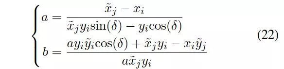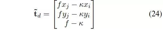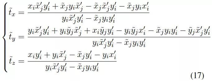 假定a=ty/d是通过离散采样得到,2个未知参数为b=tx/ty,c=tz/ty。已知一个a以后,只需要一对匹配点得到b,c。从方程(15)得到: