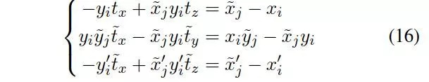 实际上方程组只有2个独立参数,因为反对称矩阵的秩为2,因此需要增加一个方程,则需要再增加第二个关联点,从(15)中任选一个即可: