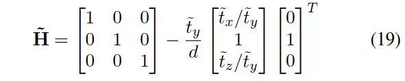 利用处于y轴法平面的无穷远点求解上面的方程组,而这些点其实都在水平面上,所以y坐标(像素坐标乘以反标定矩阵)等于0,则(7)(9)都为0。所以得到有: