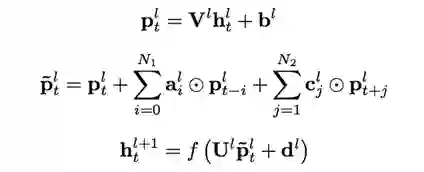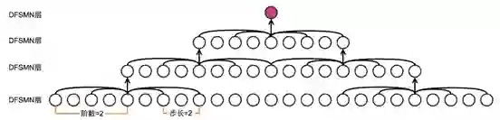 上文已经提到,除了直接增加各层的记忆模块的阶数之外,增加模型的深度也能间接增加预测当前帧的输出时模型可以利用的上下文的长度,上图给出了一个例子。