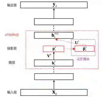 上图给出了cFSMN的结构的图示。对于神经网络的每一个cFSMN层,计算过程可表示成以下步骤①经过一个线性映射,把上一层的输出映射到一个低维向量②记忆模块执行计算,计算当前帧之前和之后的若干帧和当前帧的低维向量的逐维加权和③把该加权和再经过一个仿射变换和一个非线性函数,得到当前层的输出。三个步骤可依次表示成如下公式。