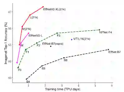 NAS 还被用于在视觉领域发现更高效的模型。EfficientNetV2模型架构是一个神经结构的搜索,对模型的准确性,模型的大小,并且训练速度联合优化的结果。