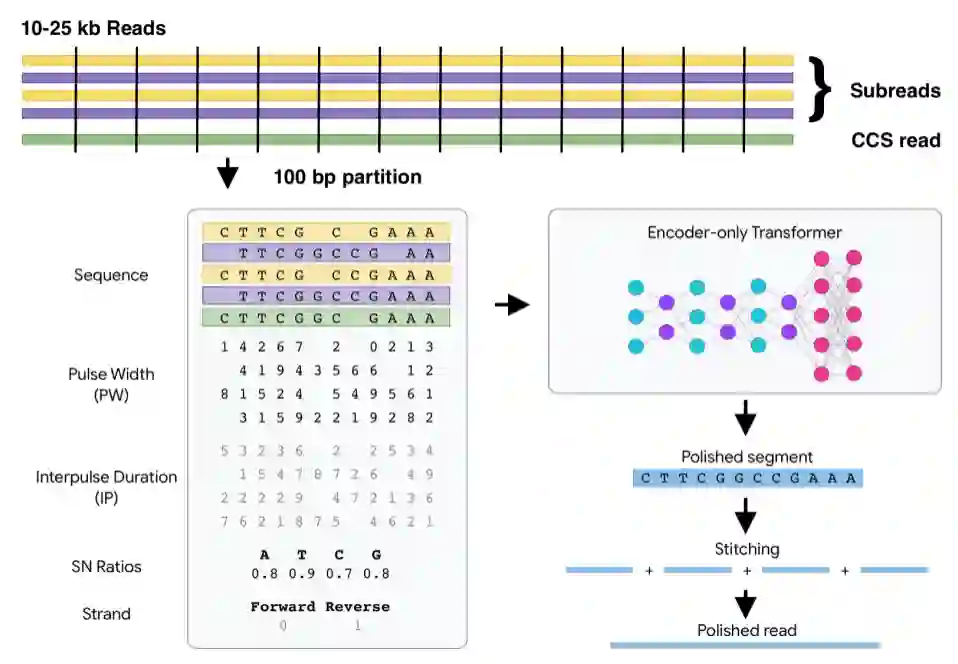 DeepConsensus的Transformer架构示意图,它可以纠正测序的错误