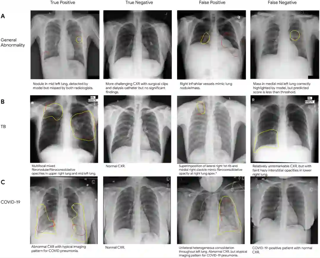 A:一般异常情况、B:结核病、C:COVID-19的真阳性,真阴性,假阳性,假阴性的胸部X光片样本