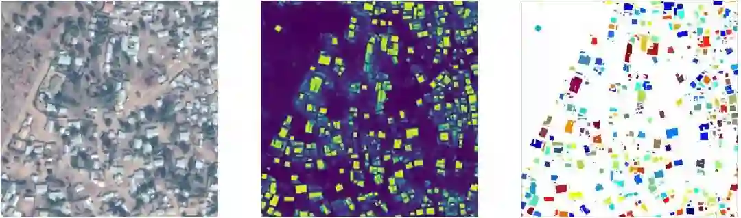 左:原始图像;中:语义分割,每个像素都有一个置信度分数,即它是建筑物还是非建筑物;右图:实例分割,通过阈值处理和将相连的组件组合在一起获得。