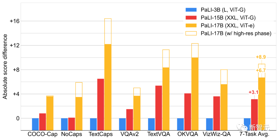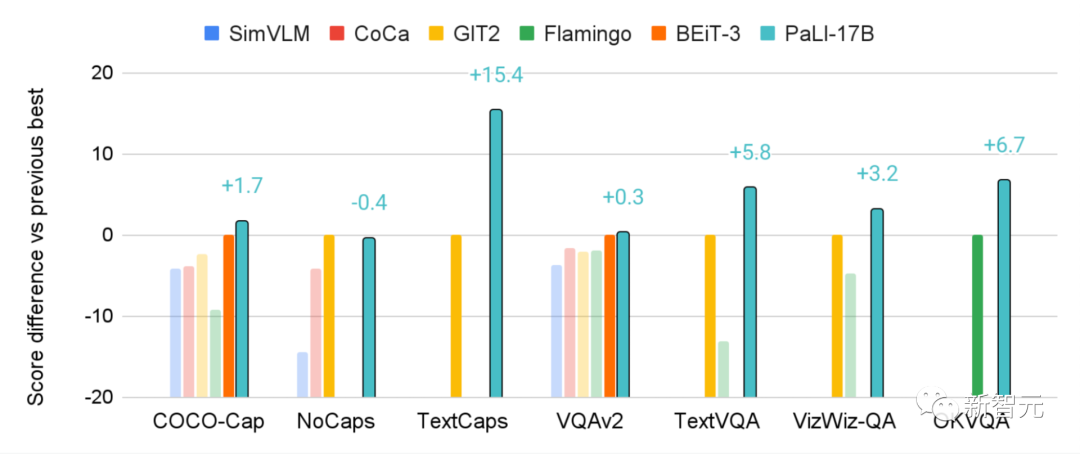 在WebLI上预训练的PaLI模型在多个图像和语言基准上取得了最先进的性能,如COCO-Captions、TextCaps、VQAv2、OK-VQA、TextVQA等等,也超越了先前模型的多语言视觉描述(multilingual visual captioning)和视觉问答的基准。