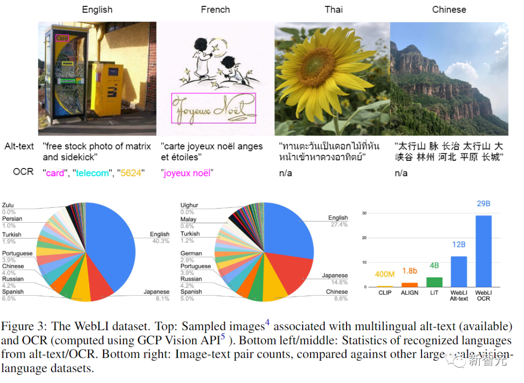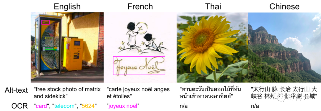 除了用网络文本进行标注外,研究人员还应用云端视觉API对图像进行OCR识别,进而得到290亿个图像-OCR的数据对。
