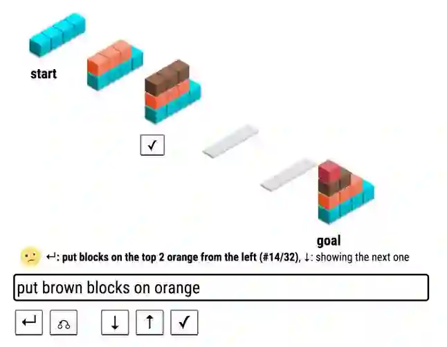 ▲ 图2. Wang et al. ACL 2016 中的 SHRDLURN 语言游戏:机器需通过与人交互从零开始学习语言。