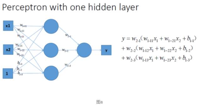 上图可看做普通的线性分类器,也就是线性回归方程。这个比较基础,效果如右图。当然有时候我们发现这样的线性分类器不符合我们要求时,我们很自然的想到那我们就加多一层,这样可以拟合更加复杂的函数,如下图a: