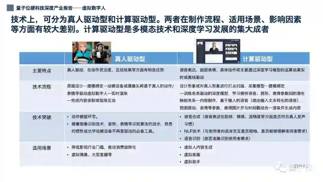 由于采用技术的分野,虚拟数字人可分为真人驱动型和计算驱动型两类。