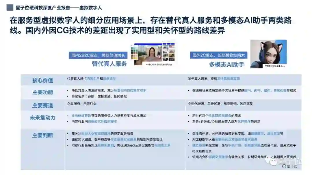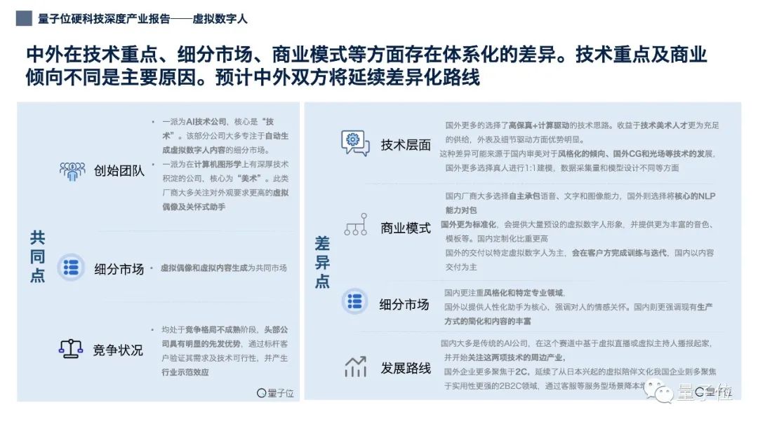 不过经量子位分析师观察,未来中外在虚拟数字人的具体使用场景上会有所合并。目前这种体系化差异也不应被理解为不同的发展速度,毕竟未来即便是在同一细分市场,也可能会出现完全不同的业态。