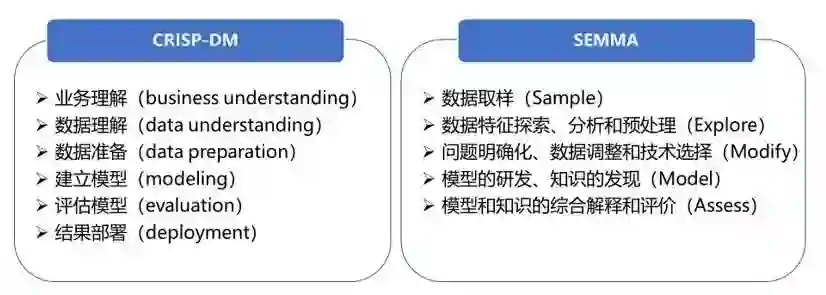 长期以来,随着数据挖掘市场的发展和成熟,由不同的组织机构提出过很多的方法论,如CRISP-DM、SEMMA、5A等,其中CRISP-DM、SEMMA是应用最为广泛。CRISP-DM (cross-industry standard process for data mining),即为“跨行业数据挖掘过程标准"。此KDD过程模型于1999年欧盟机构联合起草. 通过近几年的发展,CRISP-DM 模型在各种KDD过程模型中占据领先位置,采用量达到近60%。排在其后的是由SAS公司提出的SEMMA。SEMMA更偏重于数据挖掘的建模过程,与SAS的EM工具进行整合,其模型管理部署部分则体现在另外的工具套件中。