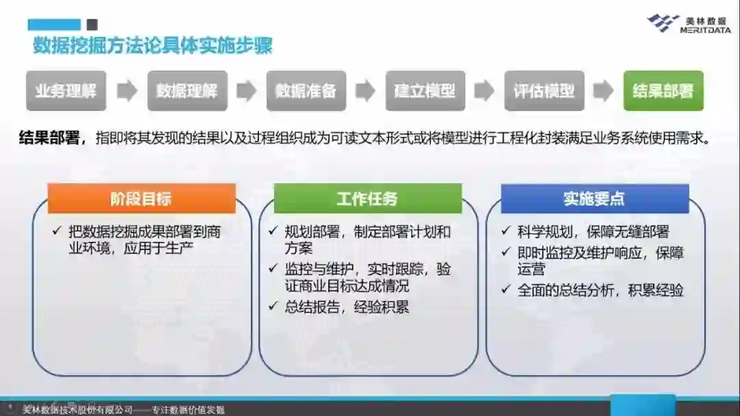 结果部署,指将其发现的结果以及过程组织成为可读文本形式或将模型进行工程化封装满足业务系统使用需求。