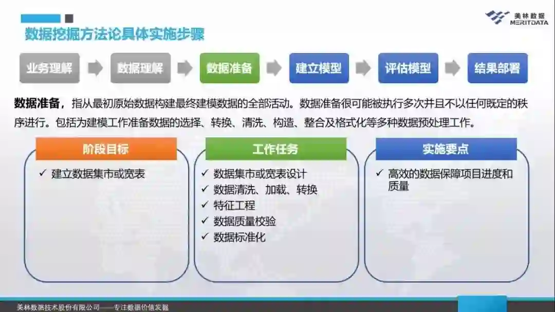 在这个阶段,最终目标是要基于业务理解阶段的建模方案构建建模所需的宽表,即将多个表信息进行整合,包括表之间的联接,明细数据的汇总加工等,同时在过程中需要对于数据的质量问题(包括缺失值、异常值等)进行处理;对数据的字段进行变换,如规范化和标准化,或都将数据进行映射变换,如Log变化,数值型按区间转换成名词型字段等多种加工策略;在特征工程这里,一方面需要从业务角度加工新的计算指标,另一方面需要进行自动特征构建、特征选择、特征降维等方面的工作,来提升模型的性能。数据准备阶段的工作,经常会随着模型性能的评估结果进行反复调整和优化,以便为建模提供更高质量的数据。