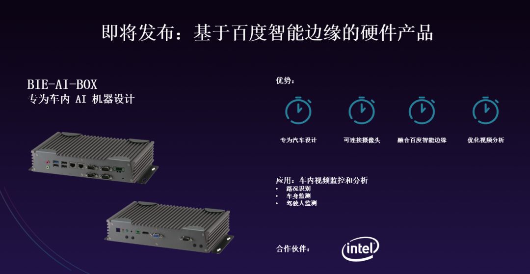 其中,和英格尔合作推出的BIE-AI-BOX,是一款融合了百度智能边缘技术专为车内AI机器设计,可连接摄像头进行优化视频分析的硬件产品,主要应用于车内视频监控和分析,包括路况识别、车身监测和驾驶人监测。