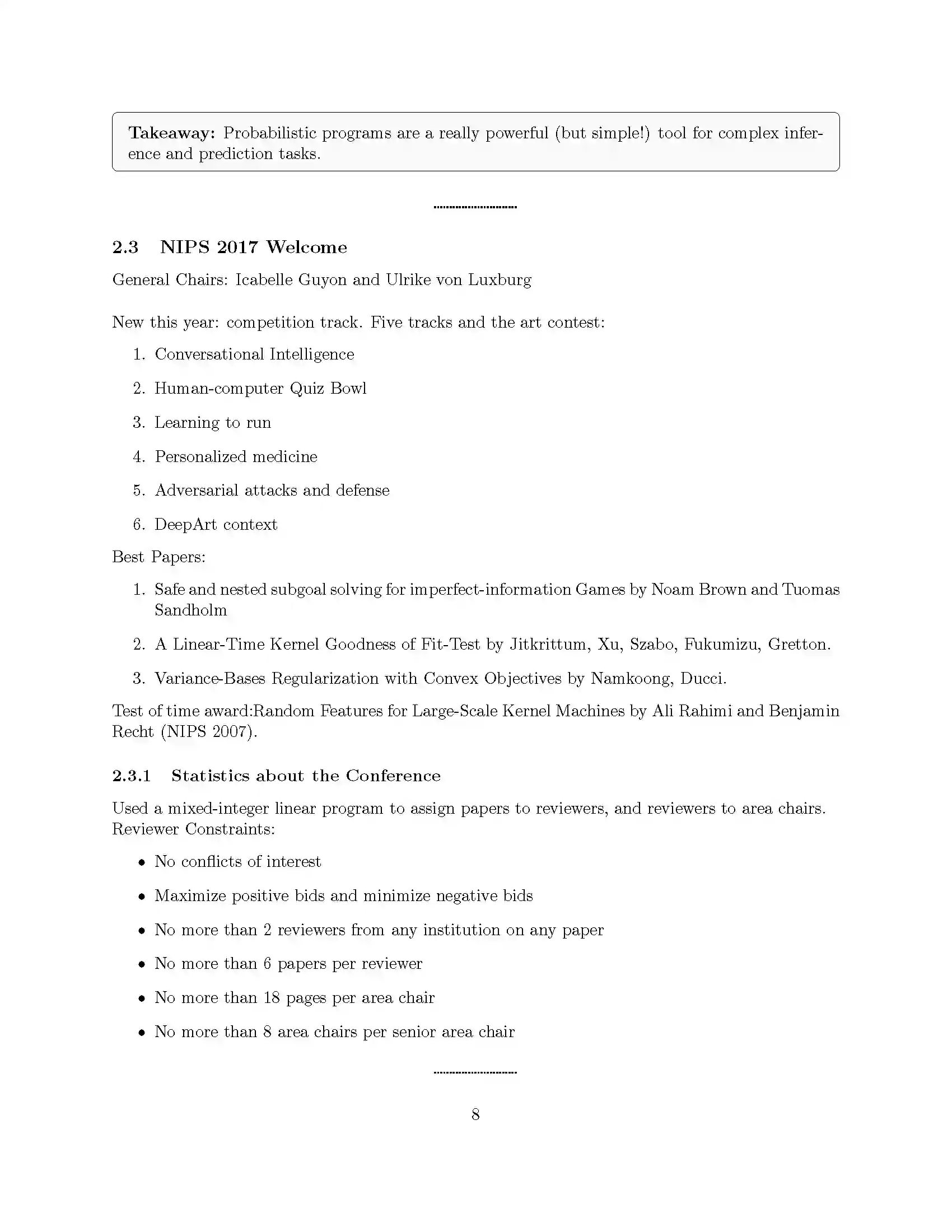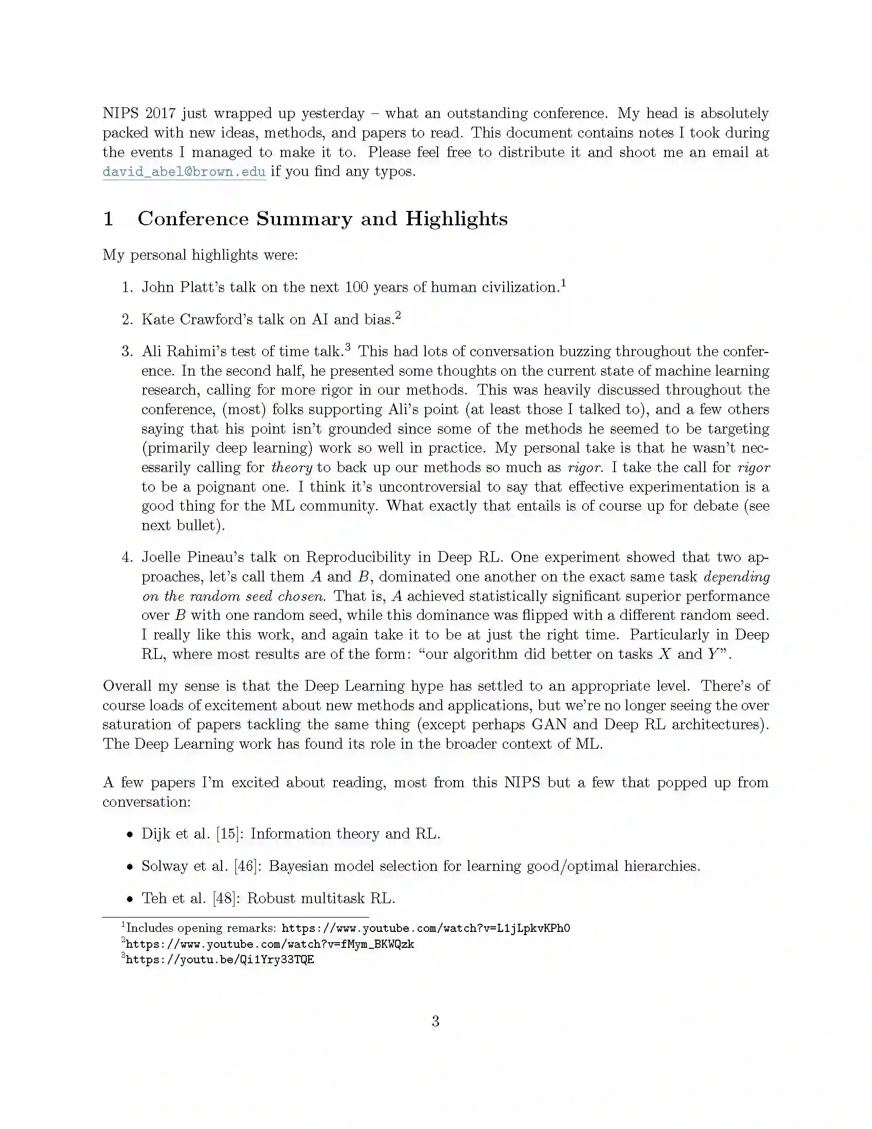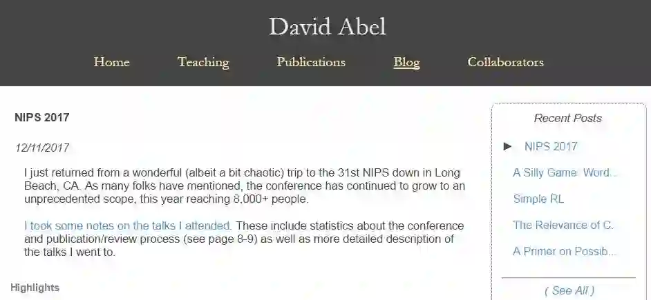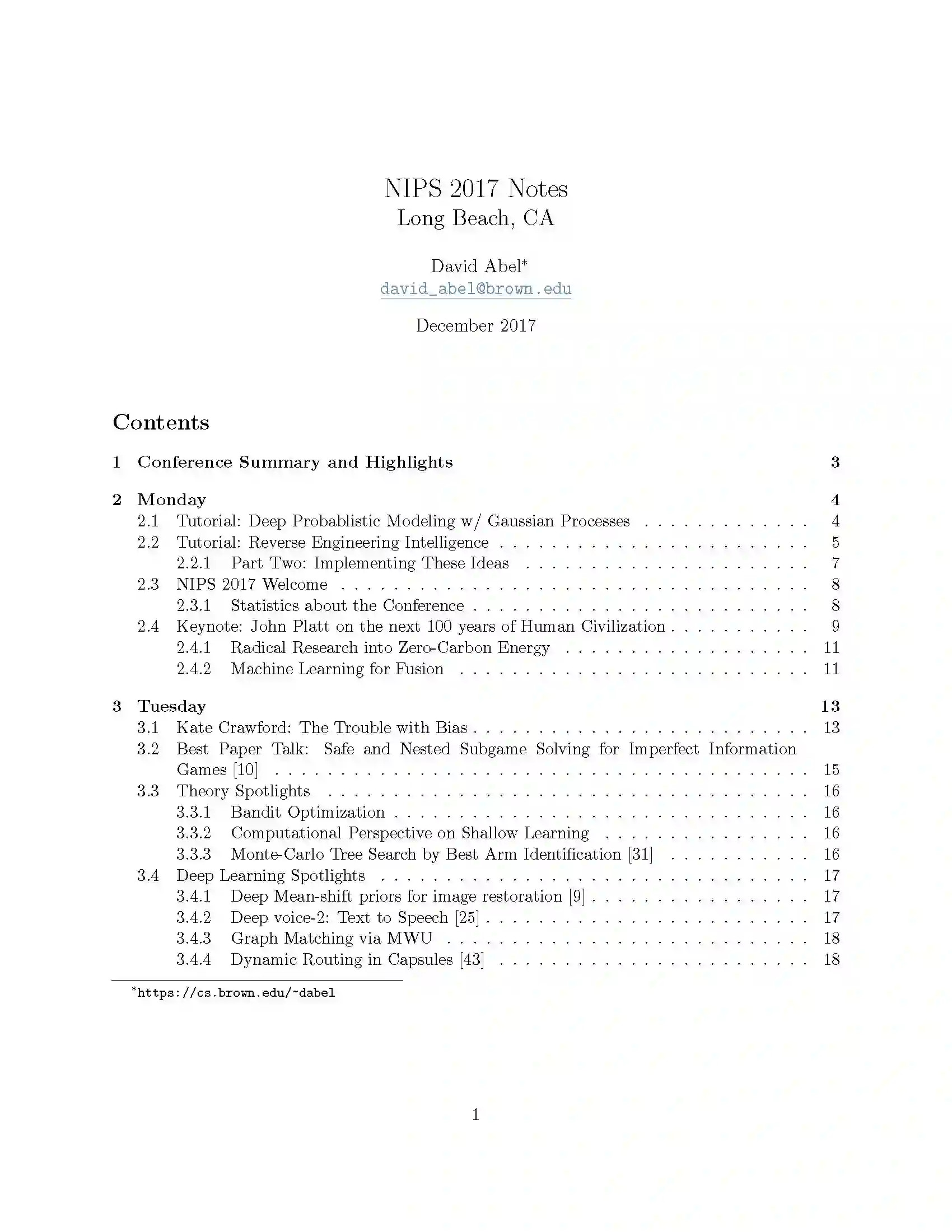 【导读】美国时间 12 月 4 日,第 31 届神经信息处理系统大会(Neural Information Processing Systems,NIPS)在美国加州长滩的会展中心正式开幕!今年参会人数达8000多人,在NIPS2017上,美国布朗大学计算机专业的博士生David Abel在其个人博客网站上写了长达43页的笔记总结,主要是介绍了他在会议期间记录的一些talk的笔记,主要是关于会议和review过程的一些统计(详细信息在报告的8-9页),以及对他自己参加一些报告的细致地回顾。专知内容组整理出David Abel的notes分享给大家!