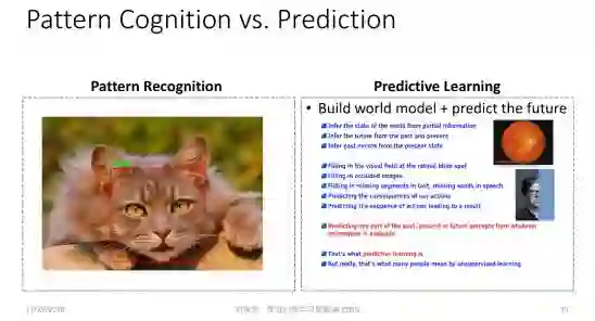 第三个方向关乎的是我们人类到底是如何学习的。到今天为止,深度学习在很多领域的成功,其实都是做模式识别。模式识别听起来很神奇,其实是很简单的一件事情。几乎所有的动物都会模式识别。人之所以有高的智能,并不是因为我们会做模式识别,而是因为我们有知识,有常识。基于这个理念,Yann LeCun 一个新的研究方向叫 Predictive Learning(预测学习)。它的思想是什么?就是即便我们没有看到事物的全貌,因为我们有常识,有知识,我们仍然可以做一定程度的预测,并且基于这个预测去做决策。这件事情已经比传统的模式识别高明很多,它会涉及到人利用知识和常识去做预测的问题。