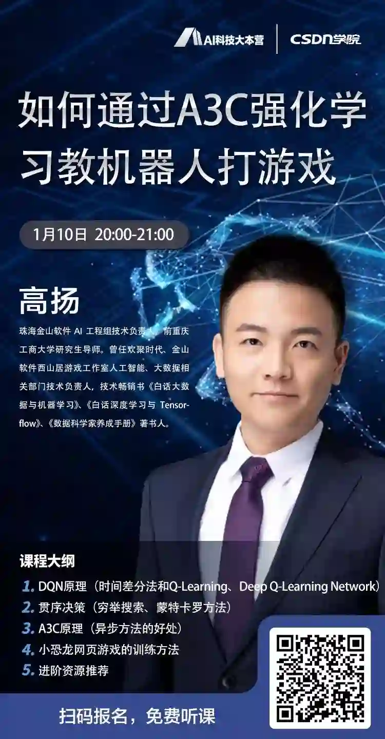 本课程是一次理论+实战的结合,将重点介绍强化学习的模型原理以及A3C模型原理,最后通过实践落实强化学习在游戏中的应用。