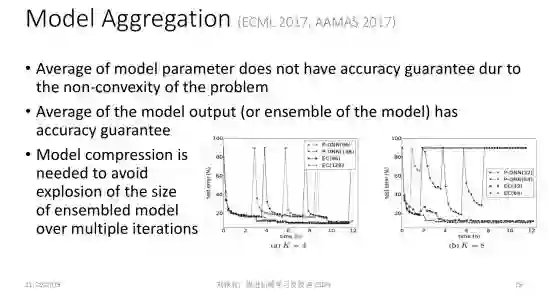 除了异步通信以外,每个局部节点计算出一个局部模型之后,怎样聚合在一起也是一个值得思考的问题。在业界里最常用的方式是把各个不同的局部模型做简单的参数平均。但是,从理论上讲,参数平均仅在凸问题上是合理的。如果大家对凸函数的性质有一些了解,就知道如果模型是凸的,那么我们对凸模型参数进行平均后得到的模型的性能,不会比每个模型性能的平均值差。
