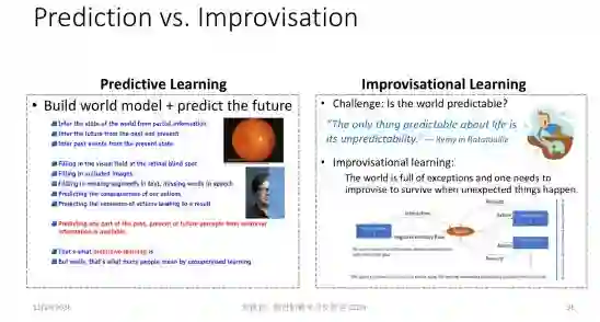我们希望在我们的眼里,世界的熵在降低。我们对它了解越多,它在我们的眼里的熵越低。同时,我们希望当环境发生变化时,比如意外发生时,我们有能力即兴地去处理。这张PPT 里面描述的即兴学习框架就是我们在跟环境互动,以及在做各种思想实验,通过无监督的方式自我学习应对未知异常的能力。