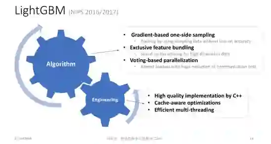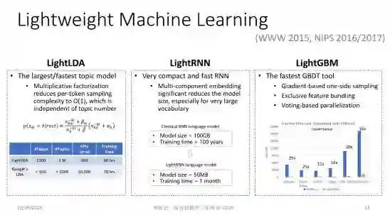 第三个轻量型机器学习的算法叫 LightGBM,这个工具是 GBDT 算法迄今为止最高效的实现。LightGBM的背后是两篇 NIPS 论文,其中同样包含了很多技术创新,比如 Gradient-based one-side sampling,可以有效减少对样本的依赖; Exclusive feature bundling,可以在特征非常多的情况下,把一些不会发生冲突的特征粘合成比较 dense 的少数特征,使得建立特征直方图非常高效。同时我们还提出了 Voting-based parallelization 机制,可以实现非常好的加速比。所有这些技巧合在一起,就成就了LightGBM的高效率和高精度。