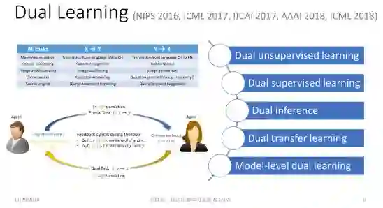 首先,我们看看对偶学习。对偶学习主要是为了解决现有深度学习方法对训练数据过度依赖的问题。当我们没有标注好的训练数据时,是否还能做有意义的机器学习?在过去的几年里,人们做了很多尝试,比如无监督学习、半监督学习等等。但是无论如何,大家心里要清楚,只有有信号、有反馈、才能实现有效的学习,如果我们对这个世界一无所知,我们是不能进行有效的学习的。