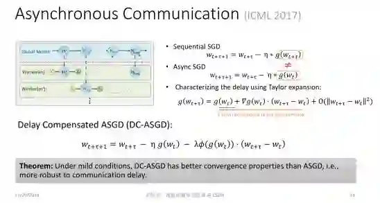 为了实现高效的分布式机器学习,人们越来越关注异步通信,从而避免整个集群被最慢的机器拖垮。在异步通信过程中,每台机器完成本地训练之后就把局部模型、局部梯度或模型更新推送到全局模型上去,并继续本地的训练过程,而不去等待其他的机器。