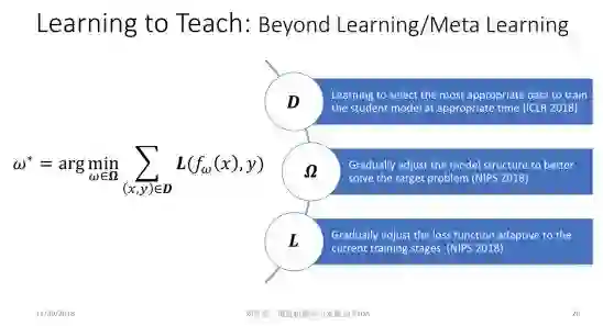 但是为什么训练数据集 D、损失函数 L 和模型参数空间 Ω 必须人为预先给定?如果不实现给定,而是在机器学习过程中动态调整,会变成什么样子?这就是所谓的 Learning to Teach。我们希望通过自动化的手段,自动调节训练数据集 D、损失函数 L 和模型参数空间 Ω,以期拓展现有机器学习的边界,帮助我们训练出更加强大的机器学习模型。