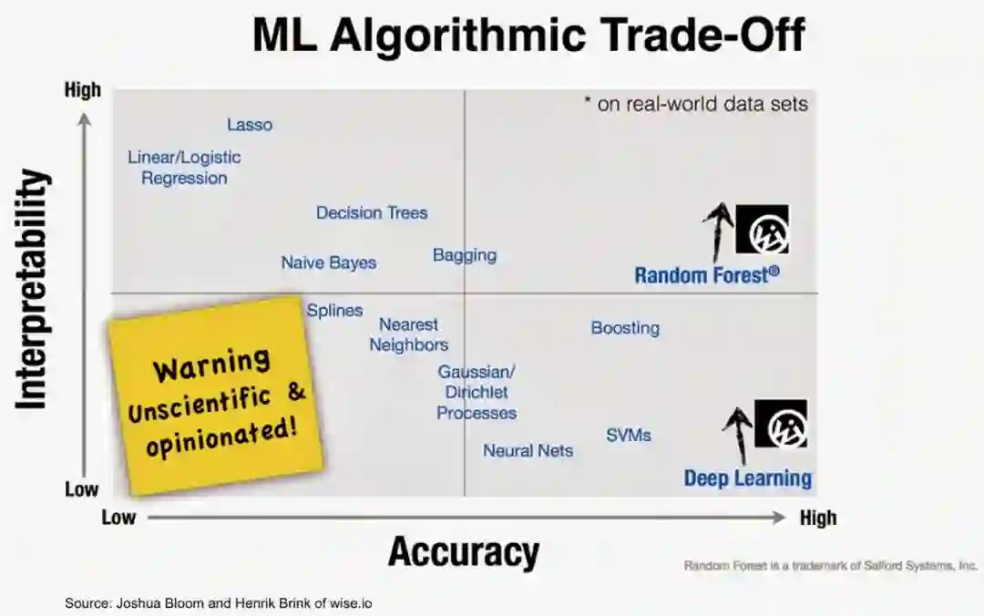 如图所示,人工智能方法的准确性和可解释性之间存在着一种相反的关系。两者之间的负相关关系如下: 解释性越大,准确性越低,反之亦然。