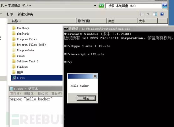 前面提到过在windows xp 03之后的版本的数据流文件都被禁止了执行权限,因此可以使用wscript来运行vbs,此处在C盘根目录使用命令: