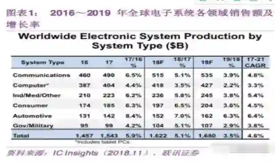 ICInsights预计2018年全球电子产品销售额16220亿美元,同比增长5.1%,2019年将达到16800亿美元,同比增长3.5%,2017~2021年CAGR=4.6%。