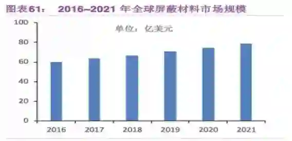 BCCResearch数据显示2013年全球EMI/RFI屏蔽材料市场规模52亿美元,2014年达到54亿美元,2016年达到约60亿美元,预计2021年将达到约78亿美元,2016~2021年CAGR=5.6%。