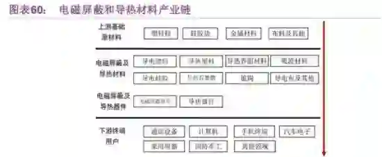 屏蔽材料、导热材料产业链的上游是基础原材料,如:塑料粒、硅胶块、金属材料等。中游是电磁屏蔽及导热材料和器件。下游是各个应用领域的终端客户。