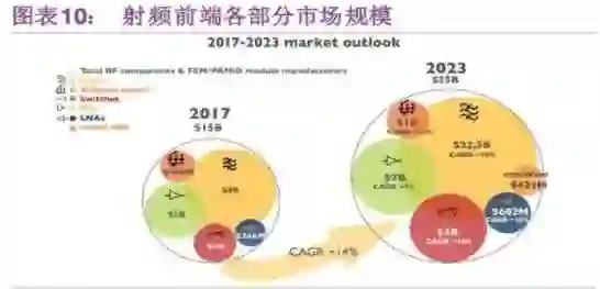 射频开关市场规模位居第三位。2017年开关为10亿美元,预计2023年将达到30亿美元,2017~2023年CAGR=15%。