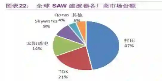 全球SAW滤波器市场份额前五位的厂商分别为村田(47%)、TDK(21%)、太阳诱电(14%)、Skyworks(9%)、Qorvo(4%),合计占比达95%。