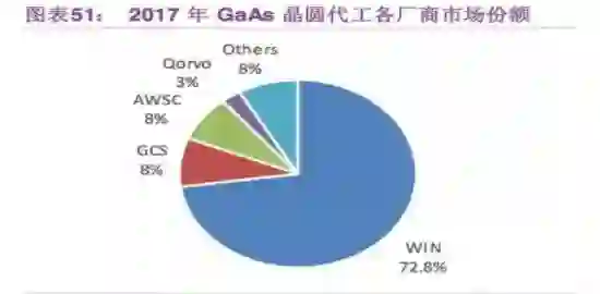 2017年砷化镓晶圆代工市场规模7.3亿美元。台湾稳懋一家独大,占比72.7%。随后是GCS(8.4%)、AWSC(7.9%)。