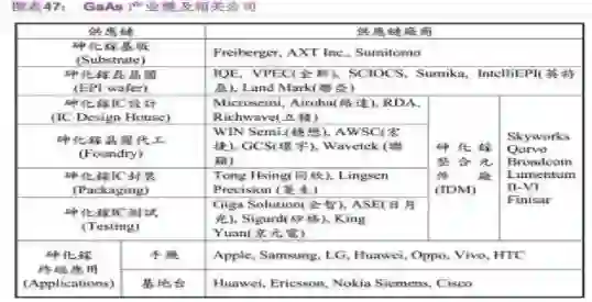 产业链上游为衬底制造,随后是GaAs外延(使用MOCVD、MBE等外延技术)。中游为晶圆加工和封测。下游为手机、基站等应用。住友电工、Freiberger、AXT三家公司占据约95%的GaAs晶圆市场份额。