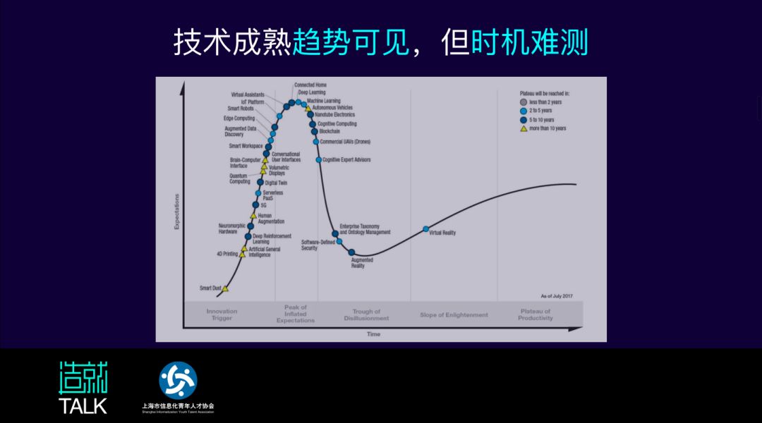 所以说技术的趋势是可以预见、可以判断的,但是我们处在这个曲线的哪个位置,是低谷还是光明期,坦白地说,不那么容易判断,甚至Gartner公司在预测技术的时候,有的时候会自己打脸。