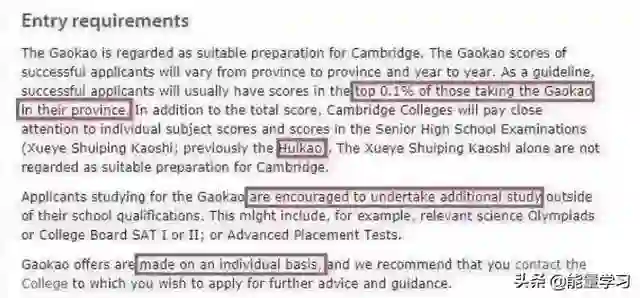 主要内容翻译成中文意思是:从2019年开始,剑桥大学接受高考成绩申请,申请人的成绩需要达到全省高考人数的前0.1%。