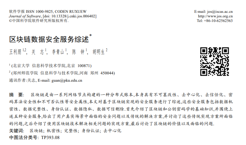 区块链是由一系列网络节点构建的一种分布式账本,本身具有不可篡改性、去中心化、去信任化、密码算法安全性和不可否认性等安全属性,本文对基于区块链实现的安全服务进行了综述,这些安全服务包括数据机密性、数据完整性、身份认证、数据隐私、数据可信删除.首先介绍了区块链和公钥密码学的基础知识,并围绕上述五种安全服务,给出了用户真实场景中面临的安全问题以及传统的解决方案,并讨论了这些传统实现方案所面临的问题,之后介绍了使用区块链技术解决相关问题的实现方案,最后讨论了区块链的价值以及面临的问题.