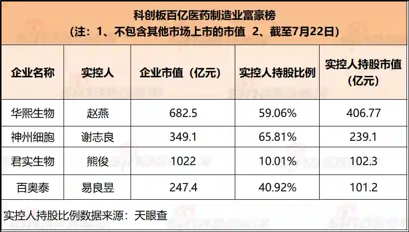 在这个医药制造企业榜单中,还催生了4位亿万富翁,分别为华熙生物实控人赵燕,神州细胞实控人谢志良,君实生物实控人熊俊,以及百奥泰易良昱。(新浪医药)