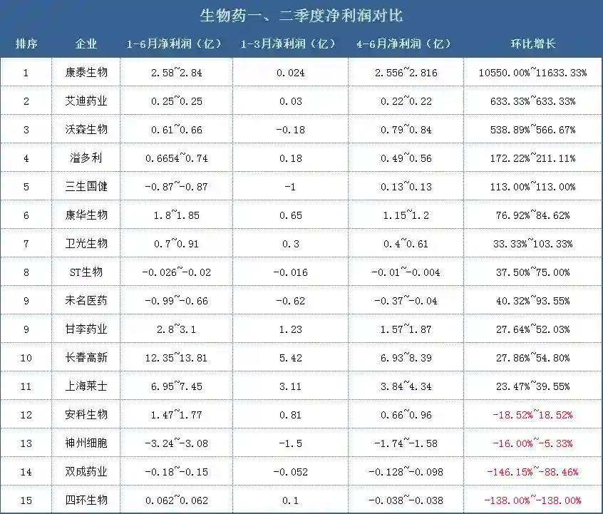 125家药企半年报预告出炉,康泰生物Q2环比100倍增长