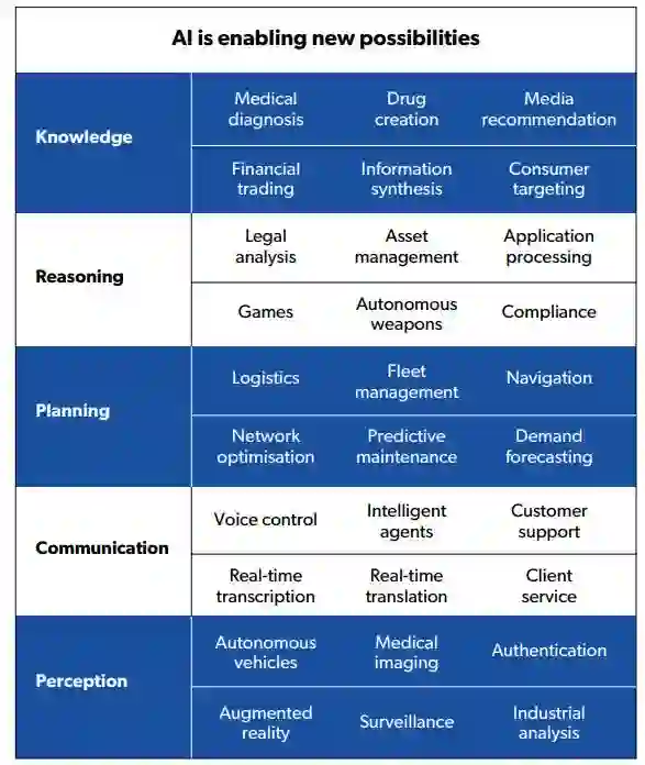 由于大多数业务流程和消费者应用程序涉及知识管理,推理,规划,沟通或感知,因此AI的进步带来了许多重要的新功能。